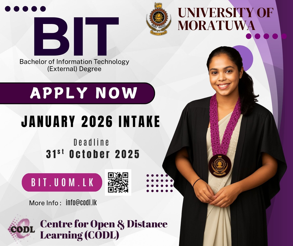 ????✨ Ready to level up your future? Applications are now OPEN for the Bachelor of Information Technology (External) Degree at University of Moratuwa. ???????? ???? January 2026 Intake ⏳ Deadline: 31st October 2025 ???? Apply Now: bit.uom.lk ???? More Info: info@codl.lk